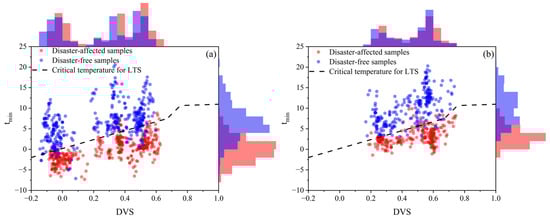 The marginal distribution of DVS and daily minimum temperature for daily samples of spring frost damage (a) and cold damage (b), as well as the daily dynamic critical temperature of winter wheat subjected to LTS. The dashed line represents the critical temperature determined through classification models and nonlinear fitting, while the bars indicate the marginal distributions. The red color signifies daily samples affected by LTS, whereas the blue color denotes samples that are unaffected.