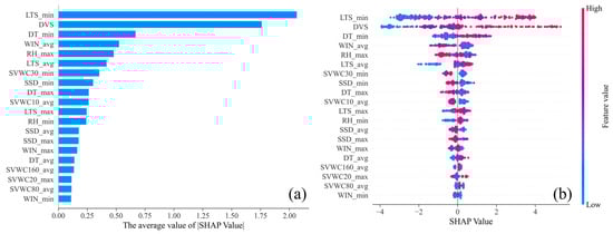 The significance ranking of the top 20 features in the daily frost identification model for winter wheat, constructed using the XGBoost algorithm, is presented along with the distribution of SHAP values. (a) Illustrates the importance ranking of the features within the identification model, and (b) depicts the distribution of SHAP values across all training samples for the various features in the identification model.