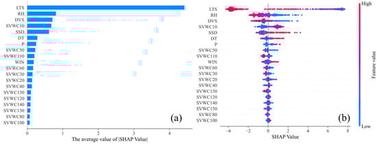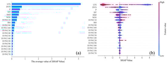 The significance ranking of the top 20 features in the daily identification model for spring cold damage affecting winter wheat, constructed using the XGBoost algorithm, along with the distribution of SHAP values. (a) Illustrates the significance ranking of the features within the identification model, and (b) depicts the distribution of SHAP values across different features for all samples in the identification model.