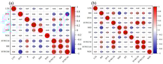 Correlation analysis of characteristic factors in the models for identifying spring frost and cold damage in winter wheat: (a) heatmap of correlations among characteristic factors in the spring frost damage identification model, and (b) heatmap of correlations among characteristic factors in the spring cold damage identification model.