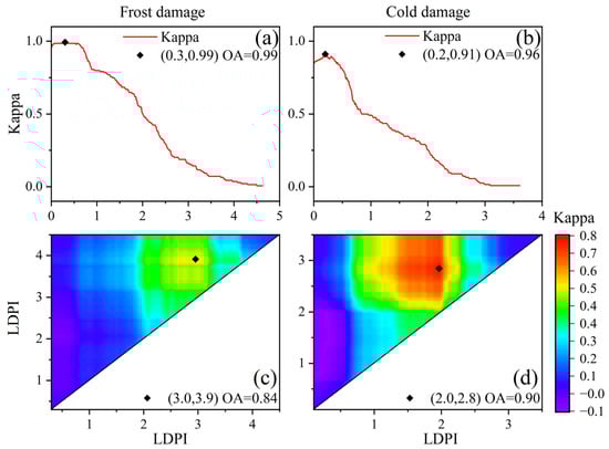 Based on the LTDI, the cumulative intensity of LTDs is extracted, leading to the development of the LDPI for the quantification of disaster grades. Utilizing samples of both disaster and disaster-free processes from two types of spring LTDs, the triggering thresholds for the disasters are established according to the principle of maximizing the Kappa value. The triggering thresholds for frost and cold damage are determined to be 0.3 and 0.2, respectively, with corresponding classification accuracies of 99.6% and 95.6% (Figure 7a,b). Following a similar approach, the grade thresholds for mild, moderate, and severe degrees of the two LTDs are identified based on process samples. The thresholds for mild, moderate, and severe spring frost are 3.0 and 3.9, respectively (Figure 7c), achieving a classification accuracy of 84.17%. For spring cold damage, the thresholds among mild, moderate, and severe grades are established at 2.0 and 2.8 (Figure 7d), yielding a classification accuracy of 90.32%. Utilizing the established triggering and grade thresholds, the final indicators for assessing the severity of frost damage and cold damage in spring are constructed (Table 8).
