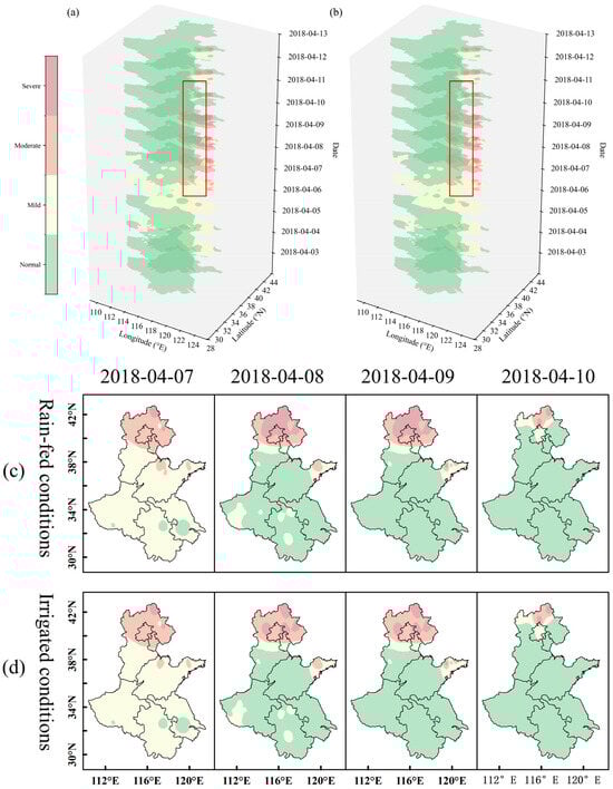 Spatial evolution of typical LTDs in the HHH region identified by the LDPI. (a) Illustrates the spatial evolution of LTD processes under rain-fed conditions, (b) depicts the spatial evolution of LTD processes under irrigated conditions, (c,d) illustrate the variations in the severity of spring LTDs affecting winter wheat within the red box area in (a,b), under both rain-fed and irrigated conditions, respectively. The red box highlights the mitigating effect of irrigation on LTDs.