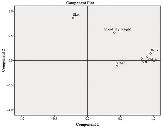Component plot of parameters (SLA: specific leaf area; SPAD: relative chlorophyll content; Chl_a: chlorophyll-a; Chl_b: chlorophyll-b; Car: carotenoids and shoot dry weight) measured in the first sampling (10/21).
