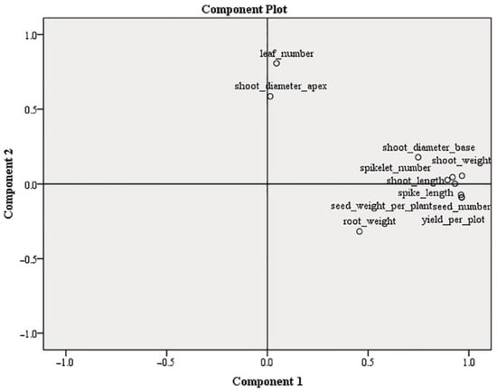 Based on the PCA results in Figure 2, the first of the two latent components explains 63.65% of the variances for the morphological variables and the second 10.40%. The former encompasses morphological variables except leaf number and shoot diameter at the apex. Therefore, the shoot and root weight, spikelet number, shoot length, seed number and weight per plant, yield per pot, and shoot diameter at the base vary together.