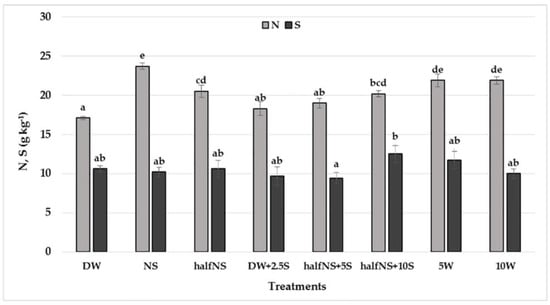 Effect of different treatments on nitrogen and sulfur content (N, S g kg−1) of wheat grains at second sampling (06/22) (n = 4; ±SE; significant differences at p ≤ 0.05 are indicated with different letters). Footnote: DW: Irrigation with deionized water; NS: Irrigation with nutrient solution; halfNS: Irrigation with a nutrient solution in half concentration; 5W: Irrigation with 5% fermented DAJ completed with fly ash solution; 10W: Irrigation with 10% fermented DAJ completed with fly ash solution; halfNS+5S: Spraying with 5% fermented DAJ completed with fly ash solution and irrigation with a nutrient solution in half concentration; halfNS+10S: Spraying with 10% fermented DAJ completed with fly ash solution and irrigation with a nutrient solution in half concentration; DW+2.5S: Spraying with 2.5% fermented DAJ solution and irrigation with deionized water.