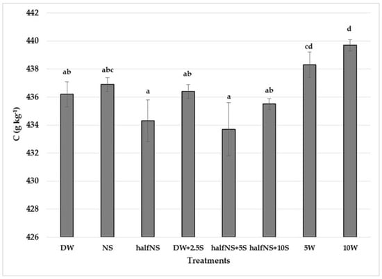 Effect of different treatments on the carbon (C g kg−1) content percentage of wheat grains at second sampling (06/22) (n = 4; ±SE; significant differences at p ≤ 0.05 are indicated with different letters). Footnote: DW: Irrigation with deionized water; NS: Irrigation with nutrient solution; halfNS: Irrigation with a nutrient solution in half concentration; 5W: Irrigation with 5% fermented DAJ completed with fly ash solution; 10W: Irrigation with 10% fermented DAJ completed with fly ash solution; halfNS+5S: Spraying with 5% fermented DAJ completed with fly ash solution and irrigation with a nutrient solution in half concentration; halfNS+10S: Spraying with 10% fermented DAJ completed with fly ash solution and irrigation with a nutrient solution in half concentration; DW+2.5S: Spraying with 2.5% fermented DAJ solution and irrigation with deionized water.