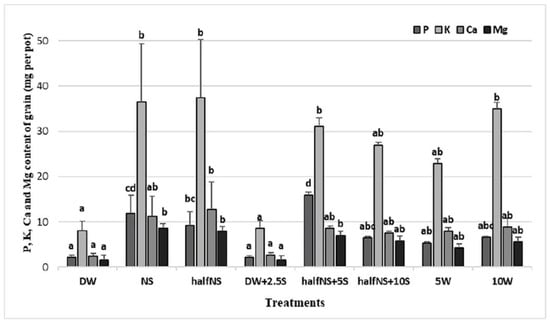 The total potassium (K), phosphorus (P), calcium (Ca), and magnesium (Mg) content incorporated into wheat grains in different treatments (grain yield per pot multiplied by the concentration of element: mg yield of pot−1; n = 4; ±SE; significant differences among data at p ≤ 0.05 are indicated with different letters). Footnote: DW: Irrigation with deionized water; NS: Irrigation with nutrient solution; half NS: Irrigation with a nutrient solution in half concentration; 5W: Irrigation with 5% fermented DAJ completed with fly ash solution; 10W: Irrigation with 10% fermented DAJ completed with fly ash solution; half NS+5S: Spraying with 5% fermented DAJ completed with fly ash solution and irrigation with a nutrient solution in half concentration; half NS+10S: Spraying with 10% fermented DAJ completed with fly ash solution and irrigation with a nutrient solution in half concentration; DW+2.5S: Spraying with 2.5% fermented DAJ solution and irrigation with deionized water.