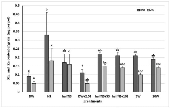 The total manganese (Mn) and zinc (Zn) content incorporated into wheat grains in different treatments (grain yield per pot multiplied by the concentration of element: mg yield of pot−1; n = 4; ±SE; significant differences among data at p ≤ 0.05 are indicated with different letters). Footnote: DW: Irrigation with deionized water; NS: Irrigation with nutrient solution; half NS: Irrigation with a nutrient solution in half concentration; 5W: Irrigation with 5% fermented DAJ completed with fly ash solution; 10W: Irrigation with 10% fermented DAJ completed with fly ash solution; half NS+5S: Spraying with 5% fermented DAJ completed with fly ash solution and irrigation with a nutrient solution in half concentration; half NS+10S: Spraying with 10% fermented DAJ completed with fly ash solution and irrigation with a nutrient solution in half concentration; DW+2.5S: Spraying with 2.5% fermented DAJ solution and irrigation with deionized water.