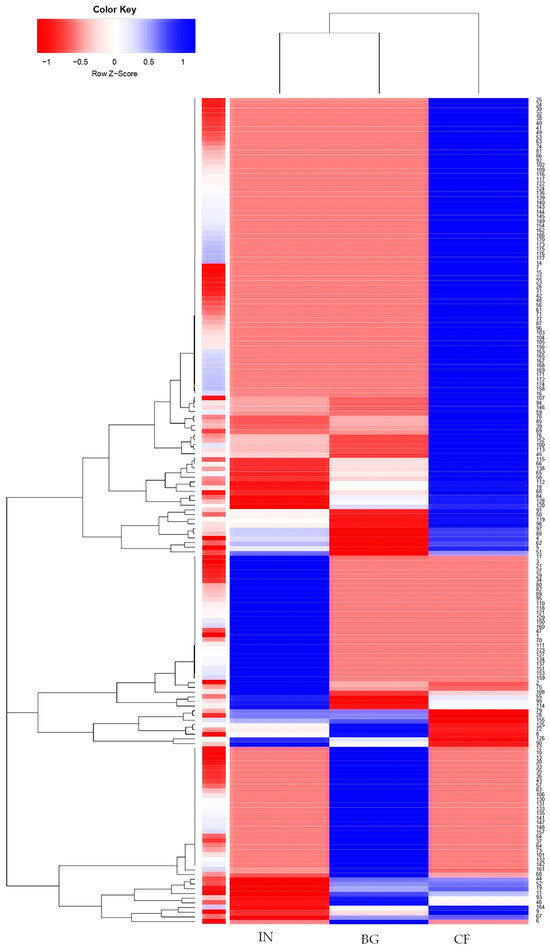 Heat map of the metabolite compounds contained in D. abundans L2B Bold biomass initial (IN) and cultivated in blue-green algae 11 (BG) medium and commercial fertilizer (CF) (n = 3 biological replicates).