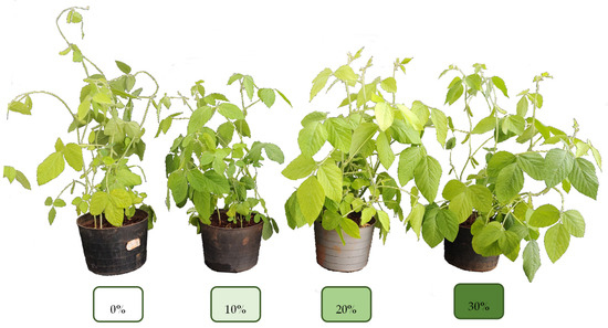 Soybean plants sprayed with increasing concentrations of D. abundans L2B Bold biomass are shown in Figure 4. It can be observed that spraying microalgal biomass promoted more uniform growth and better shoot development, such as larger leaves, favoring light capture for energy production in soybean plants. As can be seen in Figure 4, the best plant appearance was observed with the application of 20% (v/v) of D. abundans L2B Bold biomass.