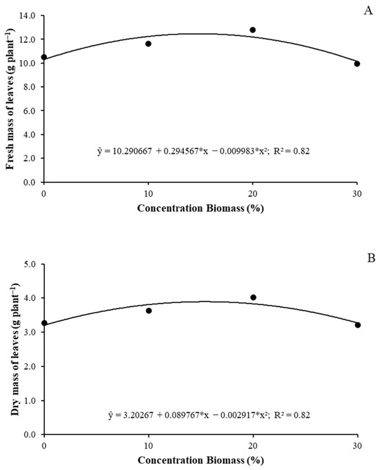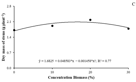 The fresh and dry leaf mass and stem dry mass were influenced by the foliar application of microalgae (Figure 5). The stem fresh mass and root dry mass were not influenced by the microalgae, with averages of 6.42 and 2.39 g/plant, respectively. The greatest increases occurred with the application of 20% microalgal biomass, with increases of 22% in fresh leaf mass (Figure 5A) and 23% in dry leaf mass (Figure 5B). An increase of 26.7% was found for stem dry mass (Figure 5C).