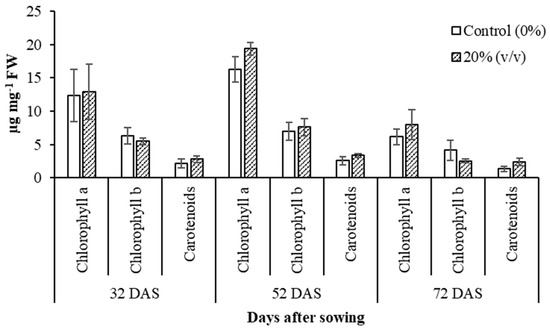Chlorophyll a and b and carotenoid content (±standard deviation) of soybean leaves with and without foliar application of 20% v/v of D. abundans L2B Bold biomass with a population of 107 cells/mL throughout the cultivation cycle. FW: Fresh weight of leaves (n = 8 biological replicates). The treatments were not statistically different (p > 0.05).