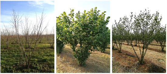 The hazelnut’s natural shape is valued and still used as a training system by growers in many traditional hazelnut districts, such as Italy, Turkey, and Spain, since it allows them to gradually renew their plants by selecting new and well-oriented lignified suckers [7]. However, some drawbacks characterize this training system, such as reducing the effectiveness of pest and disease control and setting up environmental conditions that promote pathogen development, especially in high-vigor cultivars and mature orchards [8,9]; increasing biennial bearing [10]; and leading to lower nut yields [11]. Differently, in other historical hazelnut-producing countries such as the USA and France, and more recently Chile, growers tend to shape hazelnut plants as a single trunk and open vase as a consequence of the introduction of the vigorous cultivar Barcelona into their first-generation hazelnut orchards, which, due to its high early vigor, is more suitable for tree formation than other less vigorous varieties. Nevertheless, in intermediate and low-vigor varieties this plant training system could result in lower initial hazelnut production than bush-trained plants of the same age and planting layout. More generally, this training system makes suckering easier, facilitates nut harvesting, and promotes sunlight penetration within the rows and into the inner portion of the plant canopy [12,13].