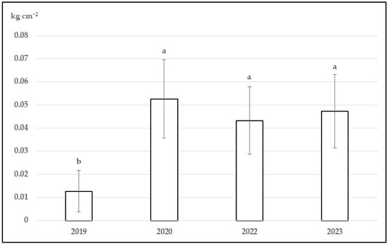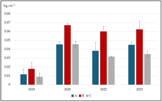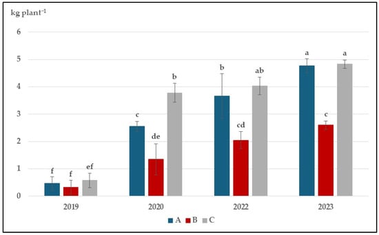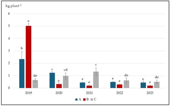 Amount of pruned wood per year during the five research years (treatment A: regular four-stemmed shrub; treatment B: single-trunk sapling form; treatment C: multi-stemmed shrub). Data are represented as mean values ± standard deviation. Different lowercase letters on the columns indicate significant differences in the interaction between treatment and year (Fisher’s test, p ≤ 0.01).