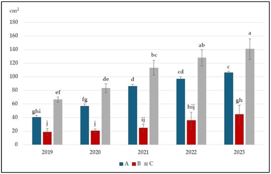 Trunk cross-sectional area (Σ TCSA) measured 30 cm above the ground of the plants subjected to different training and pruning regimes during the trial (treatment A: regular four-stemmed shrub; treatment B: single-trunk sapling form; treatment C: multi-stemmed shrub). Data are represented as mean values ± standard deviation. Different lowercase letters on the columns indicate significant differences in the interaction between treatment and year (Fisher’s test, p ≤ 0.01).