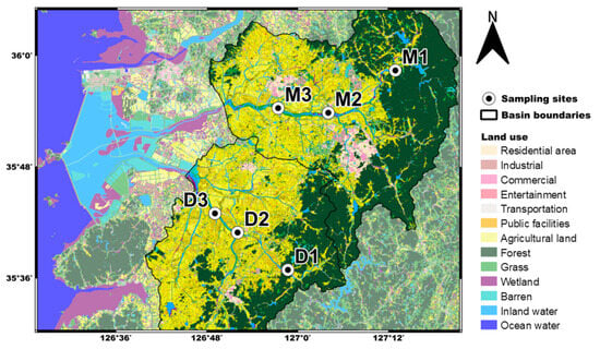 Surface water samples were collected from six sampling points in the Mangyeong River (M1, M2, and M3) and Dongjin River (D1, D2, and D3) in the Saemangeum Watershed, as reported in a previous study [30]. The detailed sampling points (Figure 1 and Table S1) were divided into upstream (M1 (Gosan) and D1 (Dongjin 1)), midstream (M2 (Samrye) and D2 (Dongjin 2)), and downstream (M3 and D3) points. Sampling was performed monthly from March 2021 to February 2022. The instrumental analysis conditions were described in a previous study [30]. The details are listed in Table S2, and they can be summarized as follows: The collected samples were pretreated using an Equan MAX online-SPE system (Thermo Fisher Scientific, Waltham, MA, USA). In this case, 1 mL of each sample was injected into the system. Liquid Chromatography–Tandem Mass Spectrometric Analysis (LC-MS/MS) was conducted using a high-resolution mass analyzer (Orbitrap Q Exactive Plus, Waltham, MA, USA), and the electrospray ionization (ESI) method was used for ionization. The mass resolution was 70,000, the mass accuracy was ≤5 ppm, and measurements were performed in full scan/data-dependent MS2 (ddMS2) analysis mode in the mass range of m/z 100–1500.