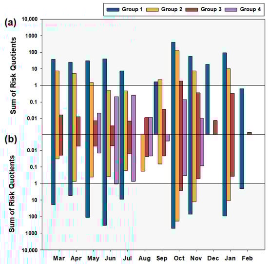 The sum of the risk quotients (SRQ) of each MoA group (1 to 4) in the (a) Mangyeong and (b) Dongjin Rivers. The values represent the SRQ for M3 and D3 from March 2021 to February 2022.