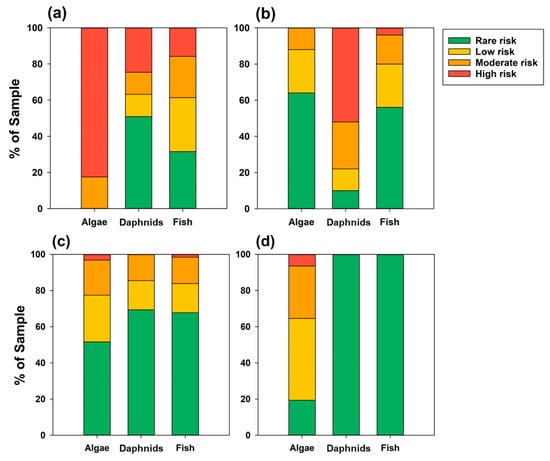 The percentages of the samples in each risk category for each trophic level (algae > daphnids > fish). RQSTU > 1 indicates a high risk (red color), 0.1 ≤ RQSTU < 1 indicates a moderate risk (orange color), 0.01 ≤ RQSTU < 0.1 indicates a low risk (yellow color), and RQSTU ≤ 0.01 indicates rare risk (green color). The plots correspond to Group 1 (a), Group 2 (b), Group 3 (c), and Group 4 (d).