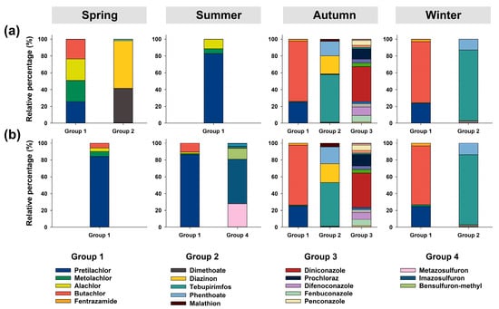 In Group 1, pretilachlor, metolachlor, alachlor, and butachlor showed similar contribution rates in spring at M3, and the risk of pretilachlor was dominant at D3 (Figure 4). In summer, the risks associated with pretilachlor use accounted for 82.75% and 86.49% of the risk at M3 and D3, respectively. In autumn and winter, the contribution rate of butachlor was approximately 70% at M3 and D3, and that of pretilachlor was approximately 25%. Pretilachlor was one of the most frequently detected substances in the study area (with a detection rate of 38.89%), and it is mainly used as a rice paddy herbicide. Butachlor is an herbicide used in rice paddies and fields, and its detection rate in the study area was 34.72%. The characteristics of butachlor, such as low soil adsorption and application to control annual weeds, appear to have continuously contributed to its risk in autumn and winter [15]. Metolachlor exhibited the highest detection frequency in Group 1 (K3), with a detection rate of 69.44%; however, its contribution to the total risk was low except in spring at M3. Pretilachlor, metolachlor, alachlor, and butachlor are α-chloroacetamide herbicides. Metolachlor, alachlor, and butachlor are priority substances that are managed in Korea. Although few studies have been conducted on pretilachlor compared with chloroacetamide herbicides, it has been reported that pretilachlor exhibits toxicity in fish by inducing behavioral changes [51]. Junghans et al. [52] reported that a mixture of eight chloroacetamide herbicides exhibited much higher toxicity than individual substances in Scenedesmus vacuolatus (algae) and that CA can be properly used for herbicide groups with similar MoA. Because mixtures are likely to have higher risks despite differences in contribution depending on the season and location, continuous management is required.