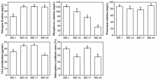 In total, 45 strains of bacteria were isolated from the biogas residue compost, 22 strains of nitrogen-fixing bacteria were screened, and the nitrogen fixation content ranged from 12.3 to 23.91 mg/L. There were 18 strains of phosphate-solubilizing bacteria, and the phosphorus solubilization content ranged from 15.53 to 121.27 mg/L. There were 20 strains of potassium-solubilizing bacteria, and the potassium solubilization content ranged from 42.24 to 90.07 mg/L. The IAA secretion of 18 strains ranged from 20.20 to 45.06 μg/mL. The siderophore synthesis rates of 21 strains ranged from 2.7% to 41.06%. Following the functional analysis, four strains with a strong capacity for comprehensive growth promotion—namely BR-1, BR-16, BR-17, and BR-44—were screened. As shown in Figure 1, strains BR-16, BR-17, and BR-44 had a stronger nitrogen fixation capacity. BR-1 had higher phosphorus solubilization content. BR-1 and BR-44 had higher potassium solubilization content. The levels of IAA produced by BR-16 and BR-17 were higher. The siderophore synthesis rates of BR-1 and BR-17 were higher.