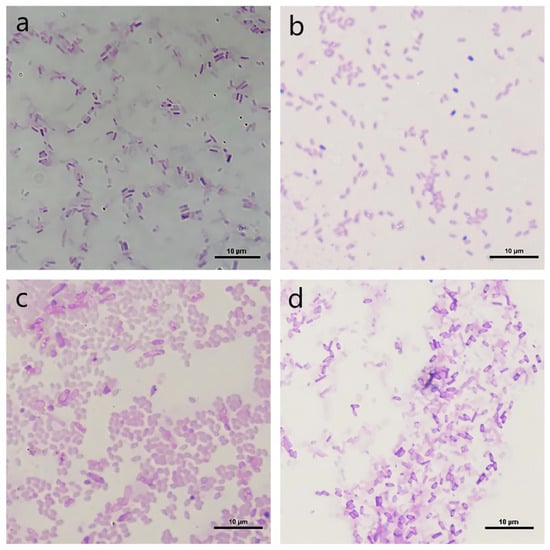 Gram-staining effects of strains. A Nikon microscope was used to capture the colored pictures of strains. (a): BR-1; (b): BR-16; (c): BR-17; (d): BR-44.