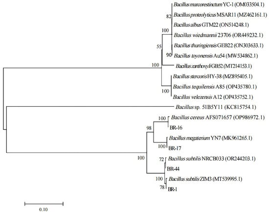 Neighbor joining was applied to construct the phylogenetic tree (Figure 3). The result showed that BR-1 had strong similarity to Bacillus subtilis ZIM3 (MT539995.1). BR-16 was highly homologous to Bacillus cereus AFS071657 (OP986972.1), and BR-17 was highly homologous to Bacillus megaterium YN7 (MK961265.1). BR-44 showed strong similarity to Bacillus subtilis NRCB033 (OR244203.1). Combining this analysis with the morphological observation of the strains, it was determined that BR-1 belonged to Bacillus subtilis, BR-16 belonged to Bacillus cereus, BR-17 belonged to Bacillus megaterium, and BR-44 belonged to Bacillus subtilis.