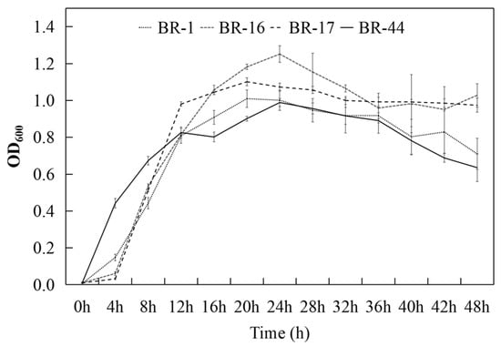 The antagonism between the strains was determined via the cross-line method. The results showed that strains BR-1, BR-16, BR-17, and BR-44 were not antagonistic toward each other; thus, they could be used for the preparation of compound microbial inoculants. The growth time courses of strains BR-1, BR-16, BR-17, and BR-44 are shown in Figure 4. The biomass of strains BR-1, BR-16, and BR-17 increased slowly at the initial stage of fermentation, from 0 to 4 h, while the biomass of strain BR-44 increased rapidly at this stage, with the OD600 reaching 0.442. At 4~12 h, the strains exhibited growth in the exponential phase. With the extension of the fermentation period, the maximum level of biomass was obtained after 20–24 h of incubation. BR-1 and BR-17 obtained their maximum biomass levels at 20 h, amounting to 1.010 and 1.101, respectively. Meanwhile, BR-16 and BR-44 obtained their maximum biomass levels at 24 h, amounting to 1.252 and 0.989, respectively, and then entered a period of stability.