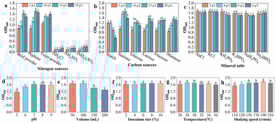 Effects of different nitrogen sources (a), carbon sources (b), mineral salts (c), pH values (d), volumes (e), inoculum sizes (f), temperatures (g), and shaking speeds (h) on microbial biomass (OD600). Different lowercase letters indicate a significant difference at p < 0.05 between different treatments.