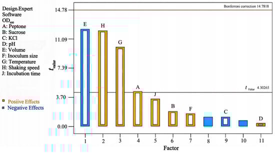 By analyzing the effects of each component on the response value, the Pareto diagram of the standardization effects of the factors was obtained (Figure 6). This indicated that the standardization effect values of factors E—volume, H—shaking speed, and G—temperature exceeded the tvalue, and they had a significant effect on the OD600 (p < 0.05). The Pvalue of the model was 0.0202 < 0.05, with R2 = 0.9955, indicating that the model was reliable and had a good correlation. Therefore, the three factors E, H, and G were selected for further experiments. Multiple regression fitting was performed on the results, and the following regression equation was obtained:
