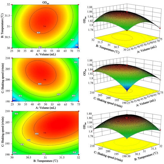 The contour plots and the 3D response surface plot showed that each response surface had a stable point, and the selection ranges of the influencing factors included the area where the maximum value was located, indicating that the liquid volume, temperature, and shaking speed exhibited significant correlations with the OD600. The shapes of the contour lines were all ellipses, indicating that the interaction effects among the factors were significant. Among them, the interaction effect of the temperature and shaking speed on the OD600 was the most significant (Figure 7).