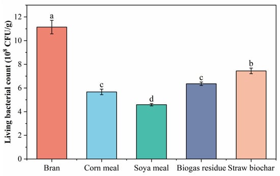As shown in Figure 8, the living bacterial count of the solid inoculant prepared by adding various substrates could meet the national standard (2.0 × 108 CFU/g). The influence of each substrate on the living bacterial count of the solid inoculant followed the order of bran > straw biochar > biogas residue > corn flour > soya meal, ranging from large to small, with the highest value of 1.114 × 109 CFU/g achieved with wheat bran; this was significantly different from those of the other treatments. Therefore, bran was chosen as the most suitable substrate for the preparation of the solid inoculant.