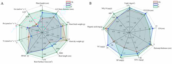 As shown in Figure 9B, compared with the CK, the S treatment increased the watermelon yield significantly, by 9.60%. The L treatment increased the fruit diameter (TD) and longitudinal diameter (LD) significantly, by 7.21% and 15.57%, respectively. There was no significant difference in the fruit skin thickness among the different treatments. The soluble protein content (SP) in the L and S treatments increased significantly, by 50.50% and 63.63%, respectively. The vitamin C content (VC) in the L treatment was significantly higher than that in the CK, by 35.08%. The nitrate content in the S treatment was significantly higher than that in the CK, by 22.83%. There was no significant difference in the soluble total sugar content (STS) or organic acid content among the different treatments.