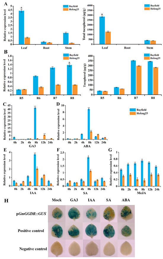 Expression pattern analysis of GmGGDR. (A) Tissue-specific expression and total tocopherol content of GmGGDR; (B) dynamic expression pattern analysis and total tocopherol content of GmGGDR; (C–G) induced expression patterns of GmGGDR under treatments with GA3, ABA, IAA, SA, and MeJA, respectively; ** and * indicate significant differences at the p < 0.01 and p < 0.05 levels, respectively; (H) transient expression analysis of transgenic tobacco leaves with the GmGGDR promoter.