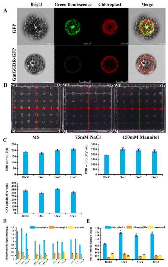 The GmGGDR gene confers tolerance to abiotic stress in Arabidopsis and soybeans. (A) Subcellular localization of the GmGGDR gene; (B) phenotypic analysis of transgenic Arabidopsis under stress treatment; (C) determination of antioxidant enzyme activity in transgenic soybeans: DN50: Dongnong50; Ox: transgenic lines. ** means significant differences at the p < 0.01 level. (D) Photosynthetic pigment content in transgenic Arabidopsis leaves: WT: Col-0; Ox: transgenic lines; M: ggdr mutant lines; C: complemented lines. * means significant differences at the p < 0.05 level. (E) Determination of photosynthetic pigment contents in transgenic soybeans: DN50: Dongnong50; Ox: transgenic lines. * means significant differences at the p < 0.05 level.