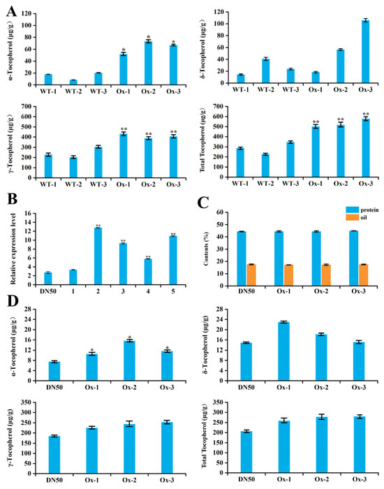 Analysis of tocopherol contents in transgenic Arabidopsis and soybean overexpressing the GmGGDR gene. (A) Tocopherol contents in transgenic Arabidopsis seeds: WT: Col-0; Ox: transgenic lines. (B) Relative expression analysis of T2 transgenic soybeans. (C) Protein and oil contents in T2 transgenic soybean seeds: DN50: Dongnong50; Ox: transgenic lines. (D) Tocopherol content in T2 transgenic soybean seeds. ** and * indicate significant differences at the p < 0.01 and p < 0.05 levels.