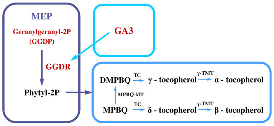 The exogenous application of GA3 induced the expression of the GmGGDR gene, thereby promoting tocopherol synthesis in soybeans. Gibberellins (GAs), key endogenous hormones derived from diterpenoids, regulate plant growth and mitigate the effects of water and salt stress during germination and seedling emergence [34,35]. The biosynthesis pathway of gibberellins is divided into three stages: the formation of GGDP, the synthesis of GA12 aldehyde, and the conversion of GA12 aldehyde to other GA forms [36]. GGDP serves as a metabolic nexus for the synthesis of essential isoprenoids, including chlorophylls, tocopherols, luteolin quinones, gibberellins, and carotenoids, with competition among various downstream branches for this substrate [37,38]. In this study, the treatment of soybean plants with high and low vitamin E contents with exogenous GA3 resulted in a significant upregulation of GmGGDR gene expressions. It is hypothesized that exogenous GA3 enhances soybean tocopherol synthesis by inducing the upregulation of the GmGGDR gene, facilitating an increased conversion of GGDP to PDP. Quantitative data suggest that GA3-induced GGDR expression may be elevated, although further experimental evidence is required to substantiate this hypothesis. Concurrently, exogenous GA3 may perturb the dynamic equilibrium among isoprenoids in plants, channeling more GGDP substrates into the tocopherol synthesis pathway (Figure 4).