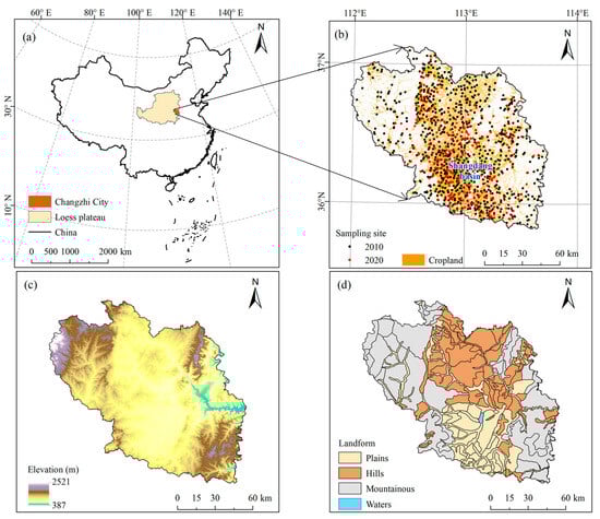 Changzhi is located in the southeastern Loess Plateau (Figure 1a). The total area of the city is 13,955 km2, with approximately 3715 km2 of croplands. The elevation varies by 2100 m, and the topography is complex. Mountainous areas account for 50.7% of the total area, whereas hilly areas cover 33.4%, primarily in the northern part of the city. Plains areas accounted for 15.9%, primarily in the southern Shangdang Basin and intermontane plains. The annual average temperature in the city is 9 °C, with the hottest month averaging 28 °C, and the coldest month averaging −12.5 °C. The annual precipitation is 618.9 mm, and the annual evaporation is 1578.8 mm. Due to variations in climate and elevation, the region exhibits diverse soil types, comprising six major soil classes, primarily including Alfisols, Ochrepts and Lithosols. The main crops grown in this area are maize, winter wheat, and soybeans. Nitrogen fertilizer application is relatively high, averaging 0.88 kg N km2 yr−1. Irrigation methods in the croplands mainly include furrow irrigation, flood irrigation, and ditch irrigation, while drainage conditions and cropland shelterbelts vary with topography.