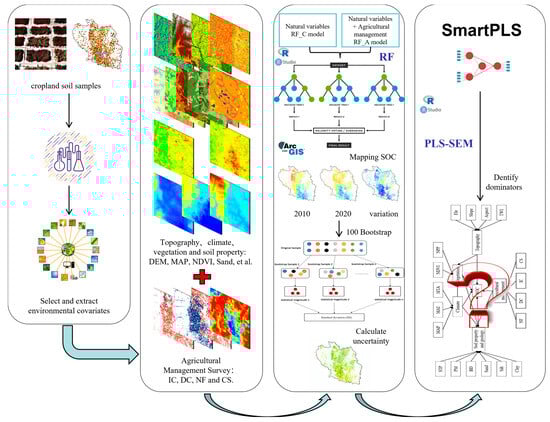 The workflow of this study is shown in Figure 2, which primarily consists of three parts: the collection of cropland soil organic carbon and environmental covariates, digital mapping and uncertainty analysis of soil organic carbon, and the analysis of the driving factors of soil organic carbon.