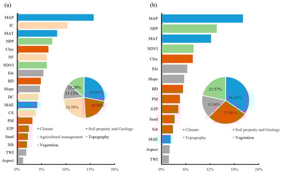 Previous studies have demonstrated that the importance of environmental variables varies depending on region and scale [34]. In this study, the relative importance of each variable in the RF model was determined, with their contributions adjusted to total 100%. In the RF_A model, mean annual precipitation (15.71%) emerged as the most influential factor for SOC variation, followed by IC (10.32%), MAT (8.20%), NPP (7.18%), clay (6.51%), and NF (6.09%). These variables accounted for 54.02% of the total relative importance, indicating that they were the primary environmental variables influencing variation in cropland SOC in the study area (Figure 3). Climate variables contributed the most (28.03%), followed by agricultural management (24.59%), soil properties and geology (20.98%), vegetation (13.28%), and topographic variables (13.12%) (Figure 3). Compared to the relative importance results of the RF_A model, in the RF_C model, the importance ranking of the other four categorical variables remains unchanged, except for the exclusion of the agricultural management variable. Regarding individual covariate factors, MAP still holds the highest relative importance, with NPP, MAT, NDVI, and Clay remaining as factors with relatively strong importance. Aside from MAE, the relative importance ranking of the individual factors does not change significantly.