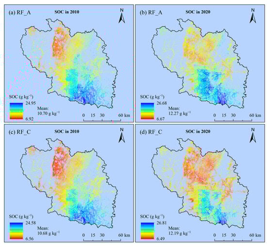 Spatial distribution of SOC in Changzhi for 2010 and 2020 as predicted by the RF_A (a,b) and RF_C (c,d) models. RF_A is the random forest model using all variables, and RF_C is the random forest model using only natural variables.