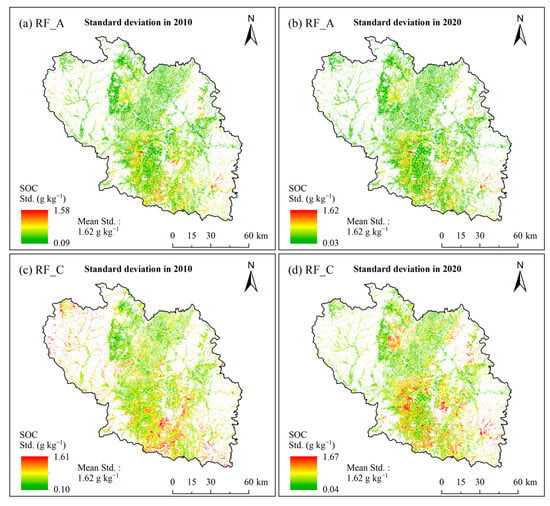 Uncertainty in the SOC mapping for Changzhi in 2010 and 2020 based on the RF_A (a,b) and RF_C (c,d) models. RF_A is the random forest model using all variables, while RF_C is the random forest model using only natural variables.