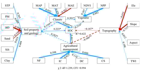 PLS-SEM path analysis results for the effects of climate, vegetation, topography, soil properties, and agricultural management on SOC. The names in the rectangles represent individual variables or categories. Rectangles denote variables or categories, with numbers in parentheses indicating loading scores. Positive and negative path coefficients or loadings are shown by blue and red lines, respectively. Solid lines represent direct effects, while dashed lines indicate indirect effects, with line widths proportional to path coefficients or loadings. Statistical significance is denoted by asterisks: *, p < 0.05; **, p < 0.01; ***, p < 0.001.