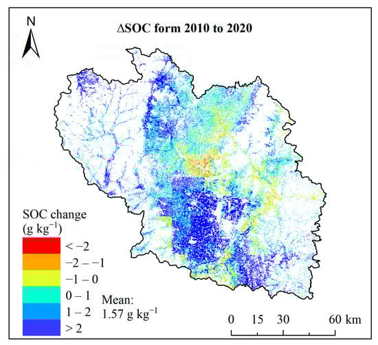 In this study, the spatiotemporal substitution method (that is, the dynamic variables corresponding to each year were used to simulate the SOC of the corresponding year) was used to map the SOC distribution of the surface 20 cm depth of the cropland in Changzhi for 2010 and 2020. Specifically, the dynamic environmental covariate raster maps for 2010 and 2020 (dynamic environmental variables) were input into the trained RF model. The RF model was run 100 times annually, generating 100 SOC maps per year. The final SOC map was derived by averaging these outputs.
