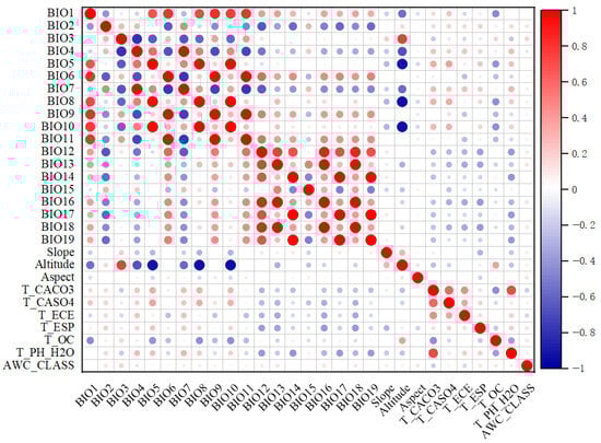 During the construction of the species distribution model, a high correlation between variables may lead to errors in the simulation of the model [35,36]. Therefore, in this study, the SDM Toolbox tool in ArcGIS 10.5 [37] was used to assess the correlation between all 29 variables using a Pearson correlation coefficient approach(Figure 2), removing environmental factor layers with correlations higher than 0.8, and retaining variables with high biological significance to the species and low correlations (Pearson correlation coefficient |r| < 0.8) for the MaxEnt analysis [38,39]. Finally, five climatic factors such as mean diurnal range (bio2) and precipitation of wettest month (bio13); three topographic factors such as altitude, slope, and aspect; and five soil factors such as pH (T_PH_H2O) and carbonate or lime content (T_CaCO3) of the topsoil layer were selected to figure in the modelling. The set of outcome variables contains the 13 bold factors used to construct the model (Table 1).