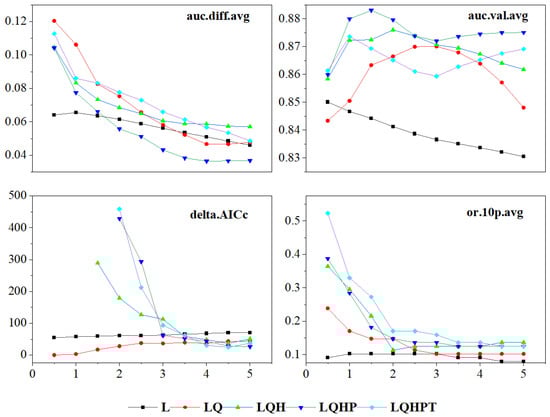 The default parameters of the MaxEnt model were set by its developers based on the comparison of their model results with realistic distributions in their studies of bird, mammal, reptile, and plant distributions [32]. However, since the MaxEnt model is a complex model in machine learning, it is sensitive to sampling bias and the complexity of the model is related to the feature functions (FC): LQPTH (L is linear liner, Q is quadratic, P is multiplicative product, T is threshold and H is fragmented hinge) and Regularization multiplier (RM) are significantly correlated [33]. In order to avoid the influence of overfitting on the migration ability of the model, this paper applies the ‘kuenm’ package in R4.2.3 to cross-combination validation of the RM (0–4) of the model starting from 0 and increasing upward every 0.5 up to 4 with the FC (LQPTH), and finally selects the model that has a significance, omission rates <5%, and with a frequency of the data (LQPTH) that has a significant correlation with the LQPTH. Omission rates <5% and smaller delta AICc values (the difference between the calibrated optimal model and the current model’s Akaike informativeness criterion) were chosen as the optimal parameter combinations to run the final model [34].