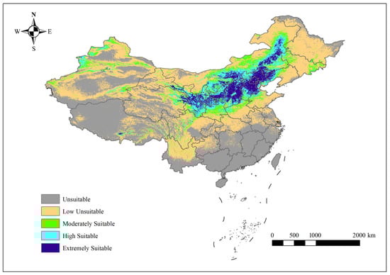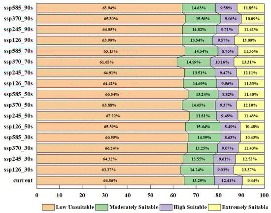 Figure 6 shows the potential spatial distribution of naked oats simulated by the MaxEnt model under current climatic conditions (1990–2020). The logistic results output from the MaxEnt model are expressed as different probabilities ranging from 0–1. Furthermore, this result is classified into five suitability classes using the reclassification tool in ArcGIS 10.5. In this classification, 0–0.05 is considered a non-suitable zone, 0.05–0.30 a low-suitability zone, 0.30–0.50 a medium-suitability zone, 0.50–0.70 a high-suitability zone, and 0.70–1 an optimum zone.