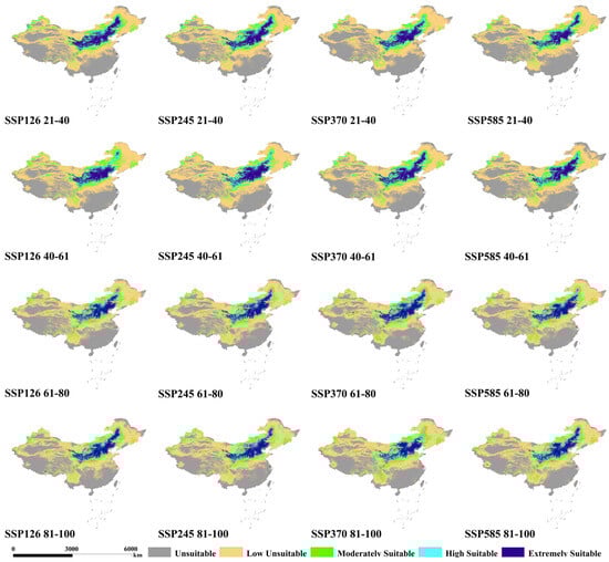 We averaged the predictions of three GCM models to create the distribution map of climate suitability zones for the future period, which helped to reduce the impact of using a single GCM model on the simulation results. Figure 7 shows the distribution of oat suitability zones under different future climate-change scenarios (ssp126, ssp245, ssp370, ssp585). The highest zone of naked oats is still mainly distributed in Shanxi, Hebei, Beijing, and Tianjin. In the future, highly suitable areas for naked oats sativa will be distributed in Shanxi, Hebei, Beijing, Tianjin, and other areas, the moderately suitable areas will be distributed in the transition zone, the middle-fitness zone will mainly be distributed around the highly suitable zone, while the low-suitability and unsuitable zones are widely distributed in the western provinces.