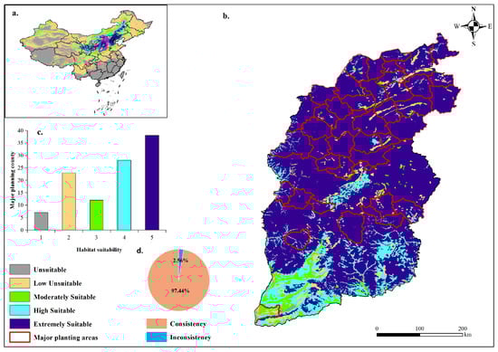 (a) A schematic representation of the geographical positioning of Shanxi Province within the territorial extent of China. (b) Consistency between climatically suitable areas and actual yield of oat. (c) Number of counties in each suitable area. (d) Map of consistency between plantingareas and climatically suitable areas.