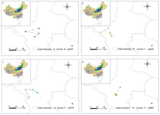 In this study, we used a geographic distribution metric tool to fit the range of species distribution under different future emission pathways to a single center-of-mass (center) point and created a vector file to predict the trend and extent of species change over time by tracking the changes in center-of-mass. We also mapped the distribution of naked oats under four emission pathways, namely ssp126, ssp245, ssp370, and ssp585, under the four-climate suitability (habitat suitability > 0.5) distribution. Center-of-mass transfer maps (Figure 10) were used to assess the potential migration trends and migration distances of naked oats under the influence of climate change. And thus, we analyzed the potential impacts of center-of-mass trends and distances on the consistency of such climatic suitability and planting areas under the current climatic conditions.