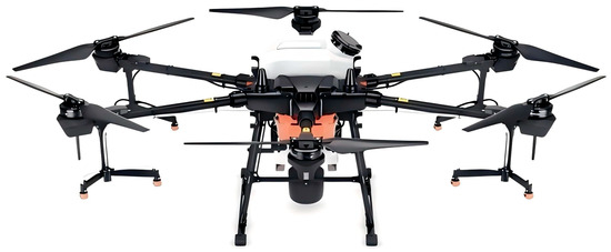 The commercial UASS used in this test was a six-rotor electrical powered aircraft (AGRAS T20, DJ-Innovations company, Shenzhen, China) (Figure 2). RTK (real-time kinematic) differential navigation technology equipped on the T20 can achieve centimeter-level positioning. For terrain tracking, a microwave radar maintained a stable altitude difference between T20 and the canopy surface of the plant to be tested. The spraying system on the aircraft consisted of 8 pressure nozzles, a 20 L tank, diaphragm pumps, and pipelines. The eight nozzles (XR110015, Spraying system Co., Ltd., Wheaton, IL, USA), symmetrically installed downward, were evenly divided into four brackets (i.e., two nozzles per bracket), and the system automatically adjusted to open one or two nozzles on each bracket during each spray treatment according to the hydraulic pressure. In this test, only one nozzle on each bracket was started for spraying in each treatment. The atomization planes of all nozzles were perpendicular to the flight direction. The technical parameters of the UAV are presented in Table 1.